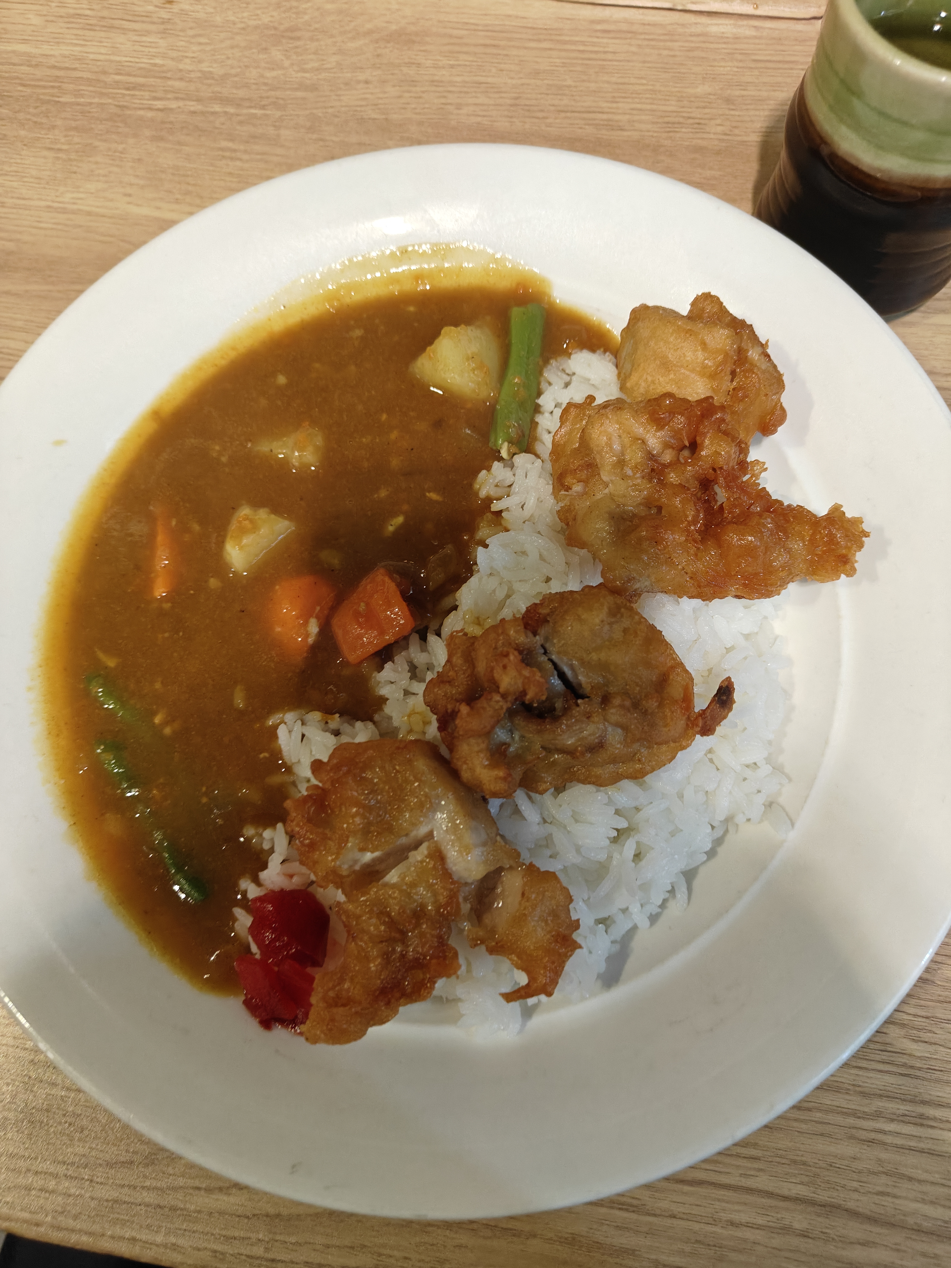 炸鸡块蔬菜咖喱算是我最喜欢的一道咖喱品类。咖喱酱似乎是店家自己配制的,与市面上甜口占主要成份的零售日本咖喱不同,这家店提供的日本咖喱有着对我而言适度的辣味。炸鸡块非常多汁,与辣味相得益彰。
