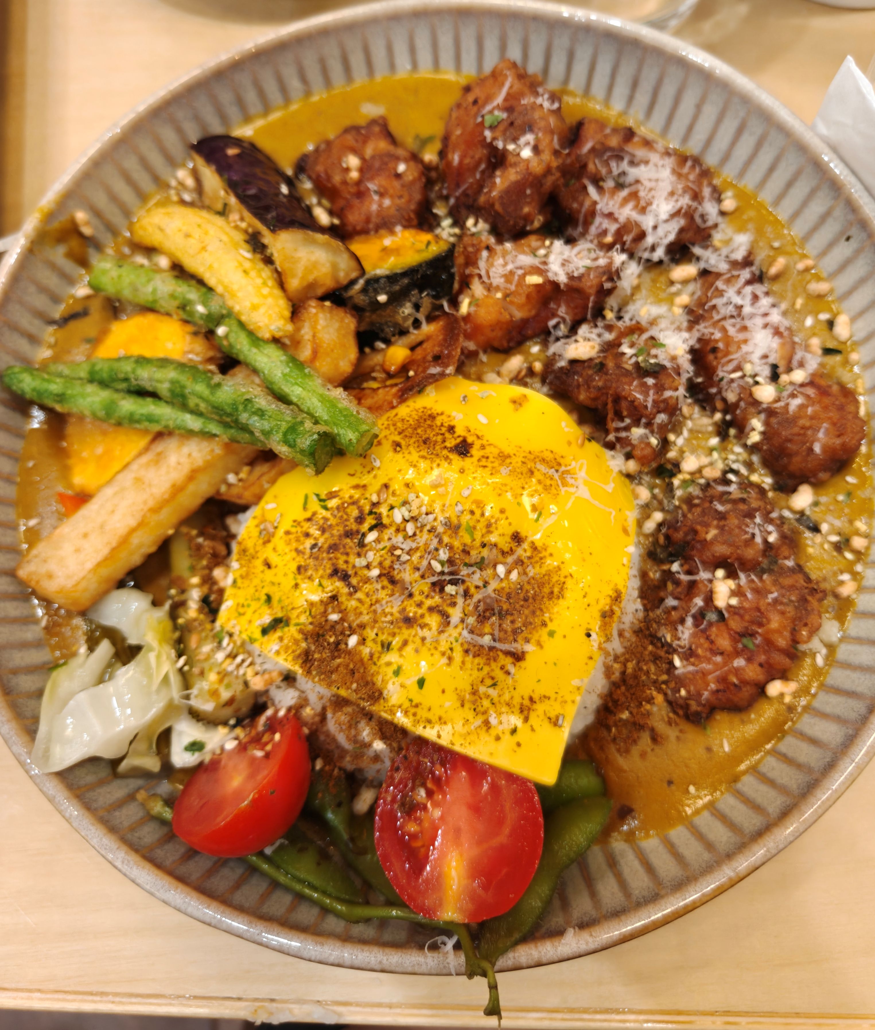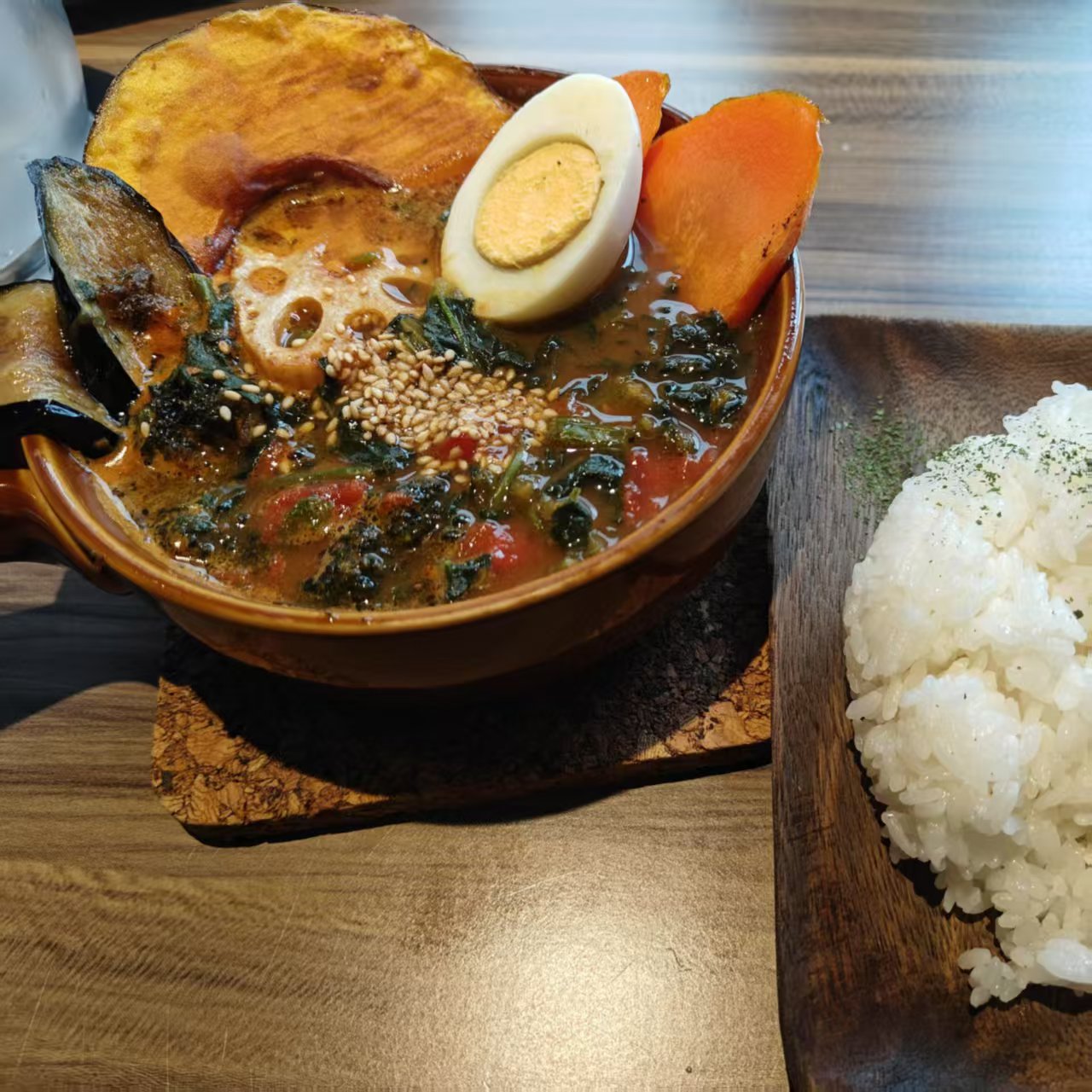 是我目前为止吃过的最好吃的咖喱品种。人气高时需要在门口签名并排队等候。汤底用完了商店会提前歇业。去北海道一定要试一下汤咖喱,如果正好在札幌,那么这一家店我也非常推荐。下图为我试过的蔬菜咖喱。选好咖喱品种之后需要自选米饭的重量(按照克数,选项从200g开始并按照100g为分段递增)和汤底(我选的是西红柿汤底)。